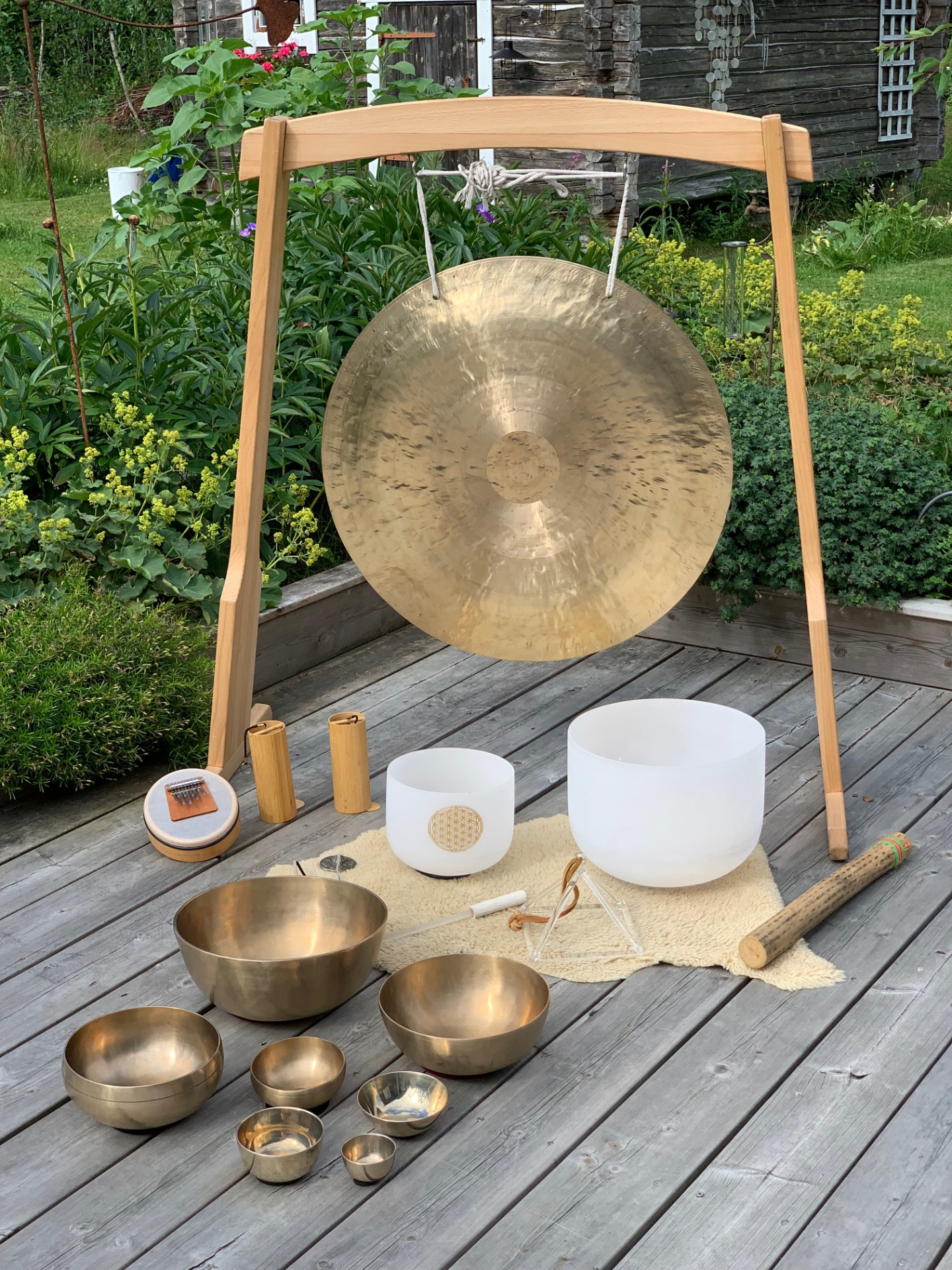Käytän sointukylvyissä mm metalliseosmaljoja, kristallimaljoja, tuulikelloja ja isohkoa gongia.